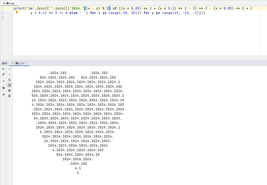 一行代码画出爱心,分享给程序员朋友送给对象。还可以将'1024.'字符串换成对象的名字。