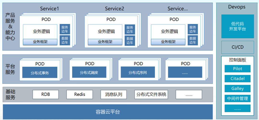 首先,在最底层提供全面的容器+k8s的运行能力;其次就是云上的公共服务,例如数据库、消息队列、缓存及文件系统等;再上一层则是面向金融行业分布式技术的平台能力,包括分布式事务、分布式调度、分布式序列等中间件能力,这些中间件也是基于容器进行部署的,同样享受容器带来的红利;最上面则是具体的产品服务及能力中心层,该层其实就是一个个的微服务,只是在开发的时候业务人员只关注业务逻辑即可,在构建及部署的时候,自动会给每个微服务增加一个服务边车甚至数据边车,组成一个可快速弹性伸缩的POD,这样其就可以根据实际业务的流量快速进行弹性扩展。除此之外,还会有基于云原生体系下的完整的Devops体系,提供全面的从开发到运维的管控能力。