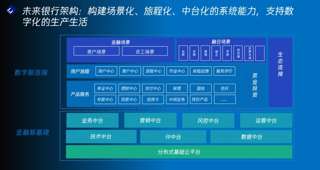 在产业连接方面,联合方案基于业务中台、风控中台、数据中台、AI中台等一系列中台层支撑,提供了企业收付、现金管理、小微融资、供应链金融等多样化的专业金融服务平台。在专业化的服务能力方面,针对不同的产业形态、业务场景甚至具体的企业客户,可在中台层和产品服务层之上快速灵活定制专业化、特色化、一体化的综合金融服务解决方案,真正实现“产业+金融”的数字化融通,使得金融能力能够高效输出到产业端,为实体经济赋能。